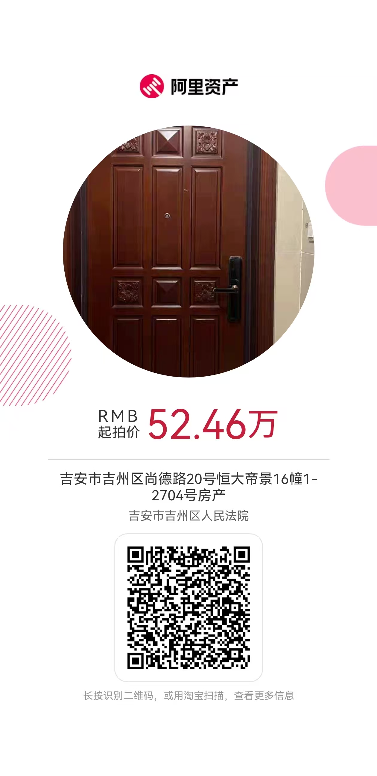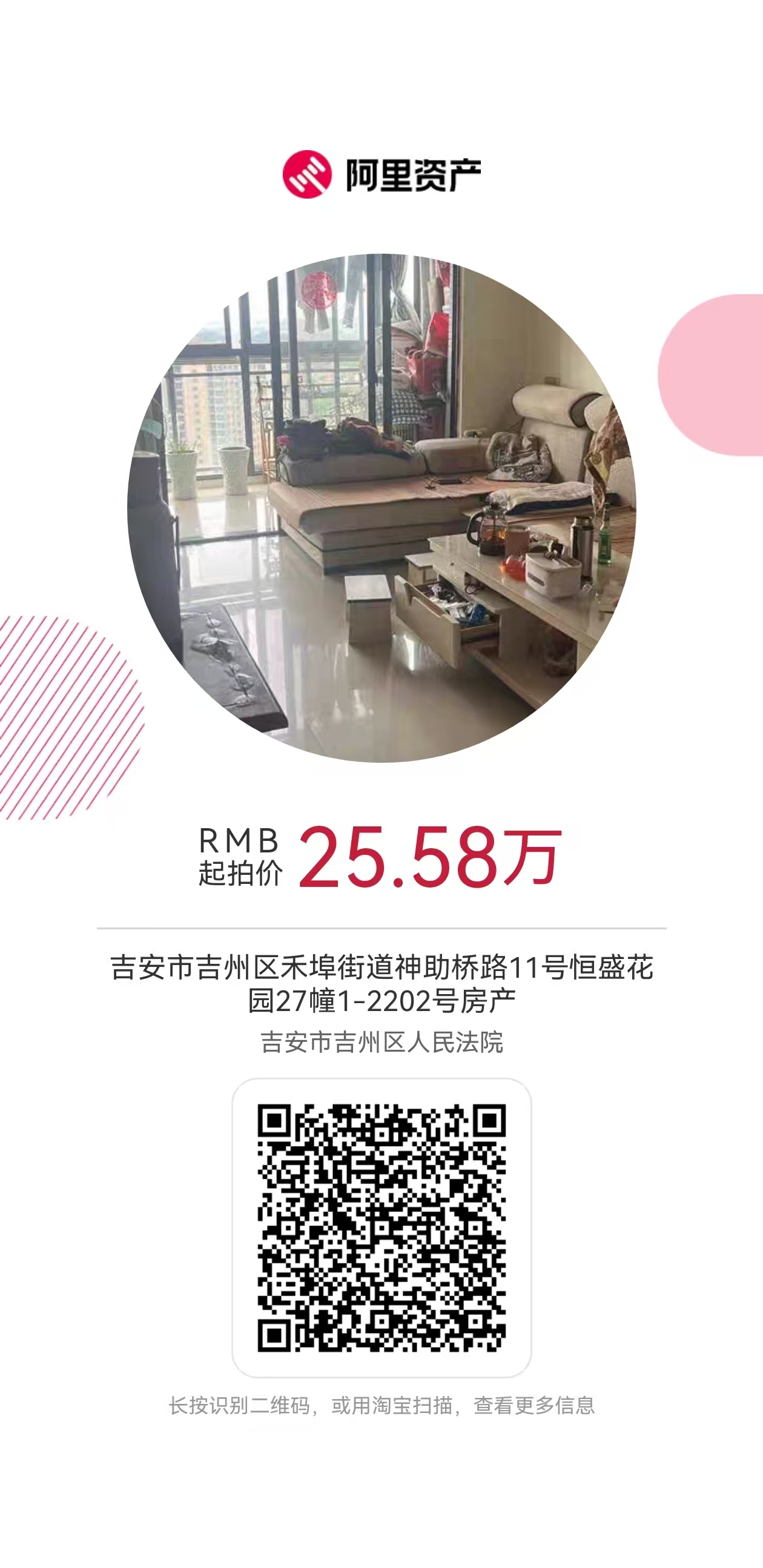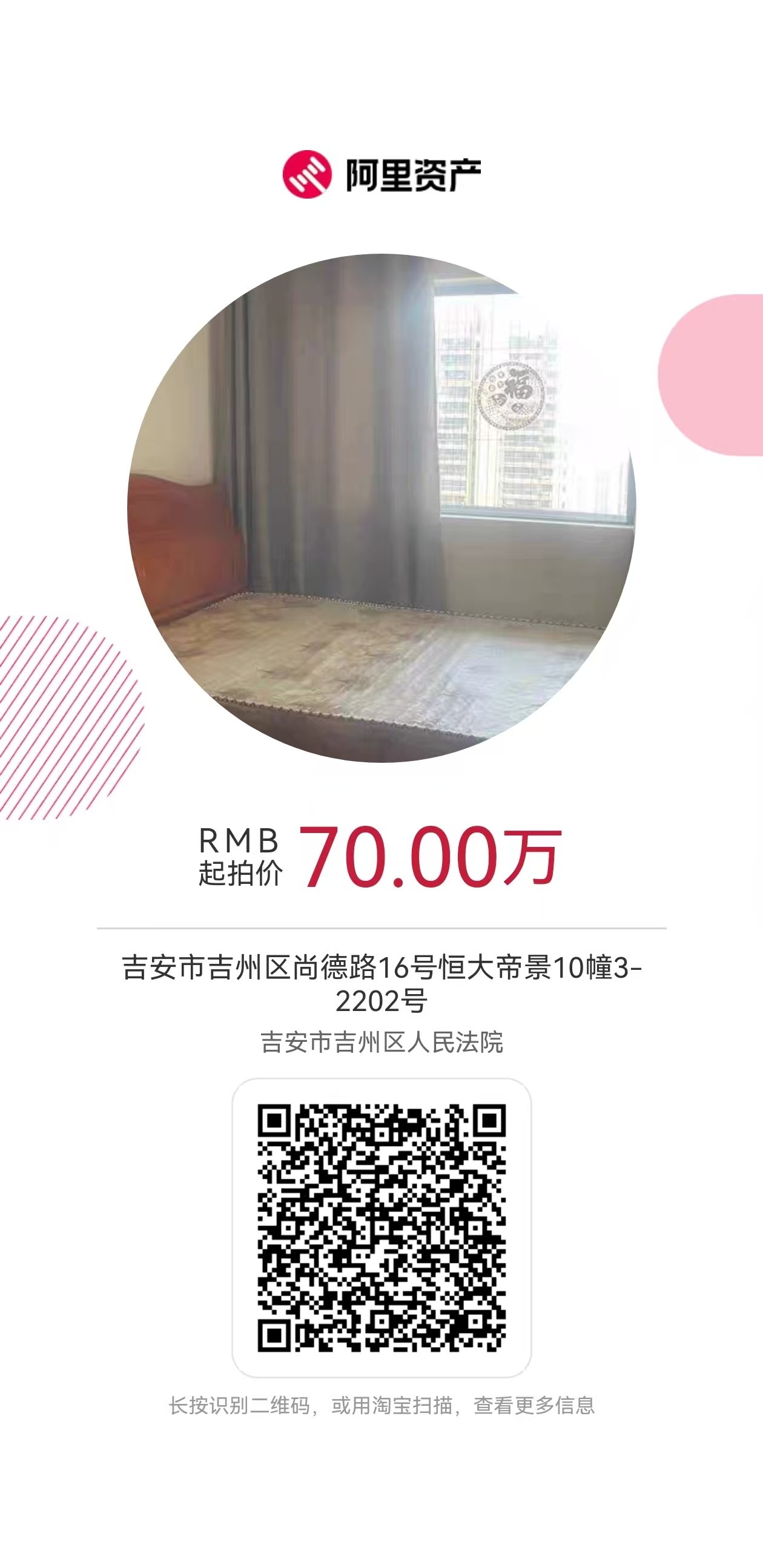 以下是本公司已挂网法拍房,价格优惠,性价比极高,有意向的朋友请扫二维码在阿里资产了解具体信息!